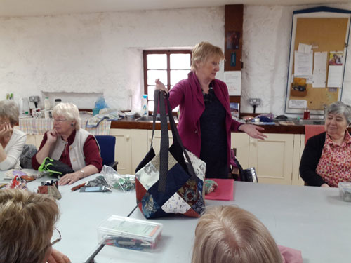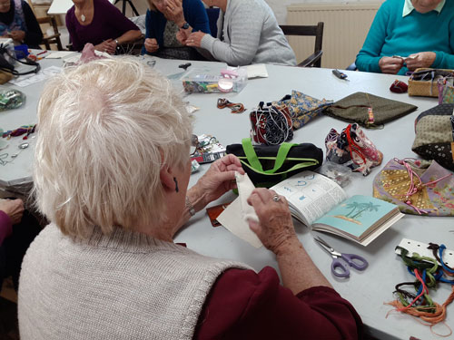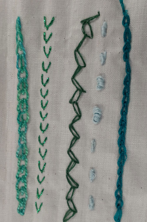 Today we had a lovely time speed stitching. We all had 10 minutes each to stitch a line then fold over and pin then hand onto the next person. Have a look at the results below.