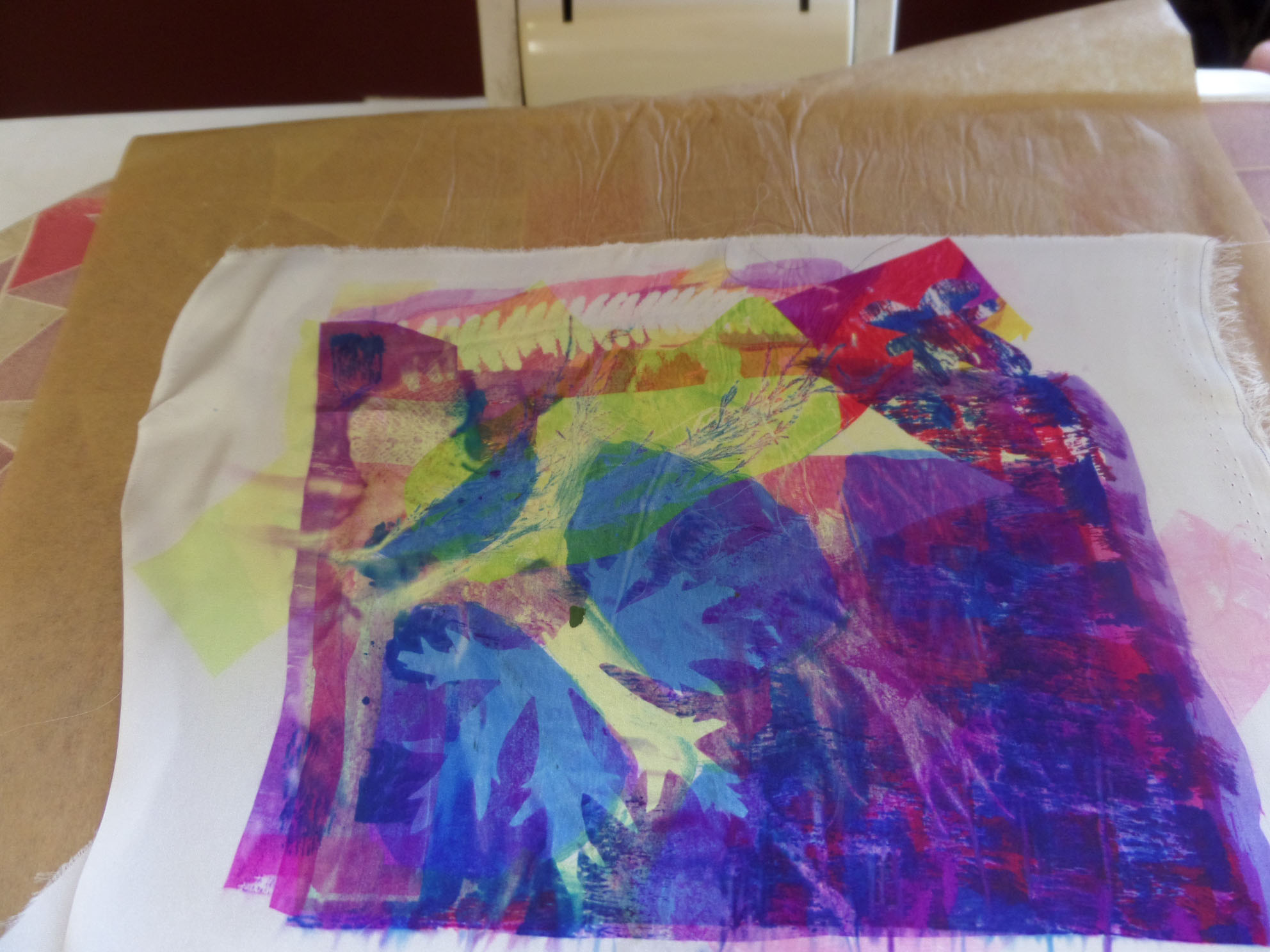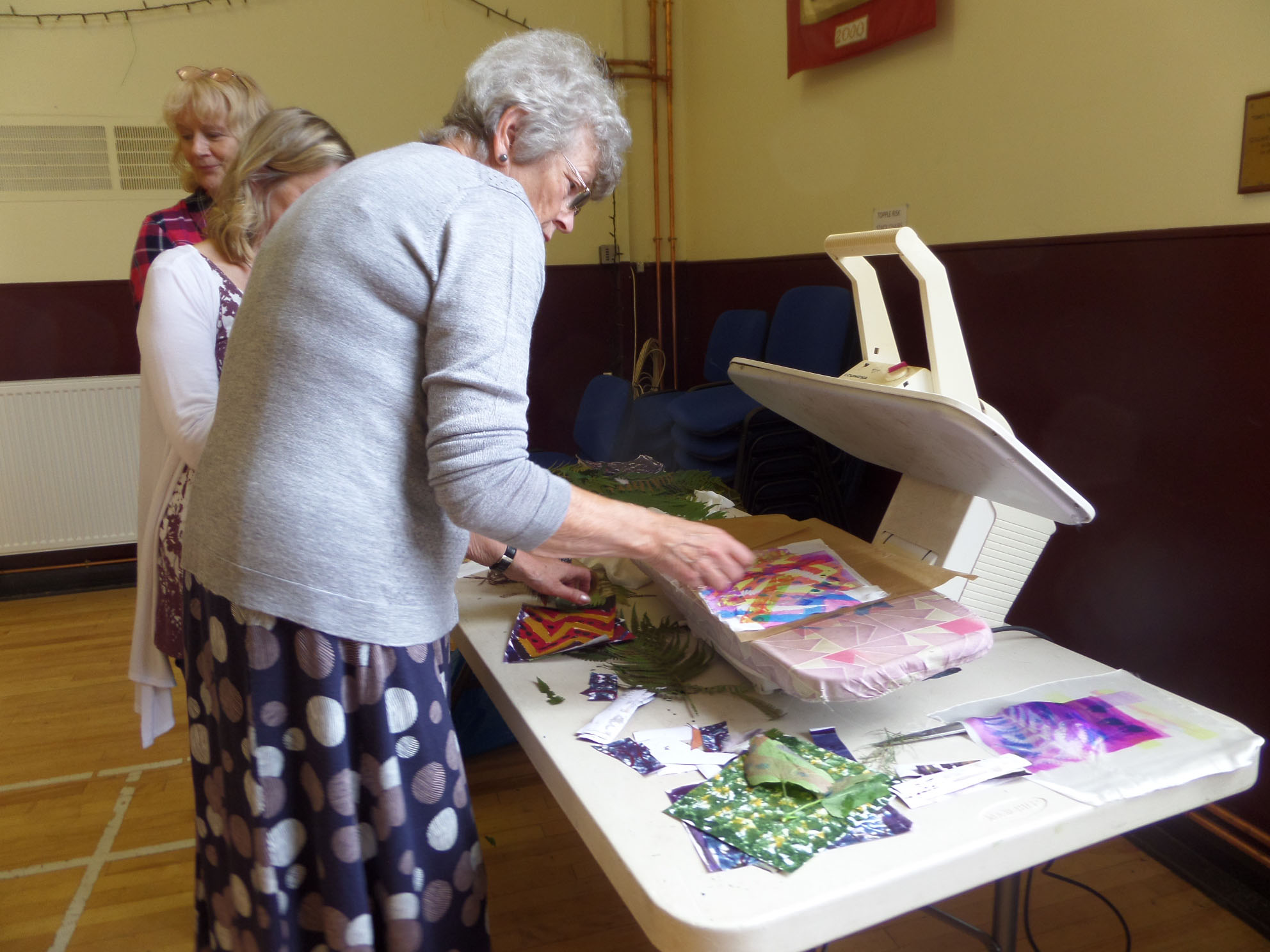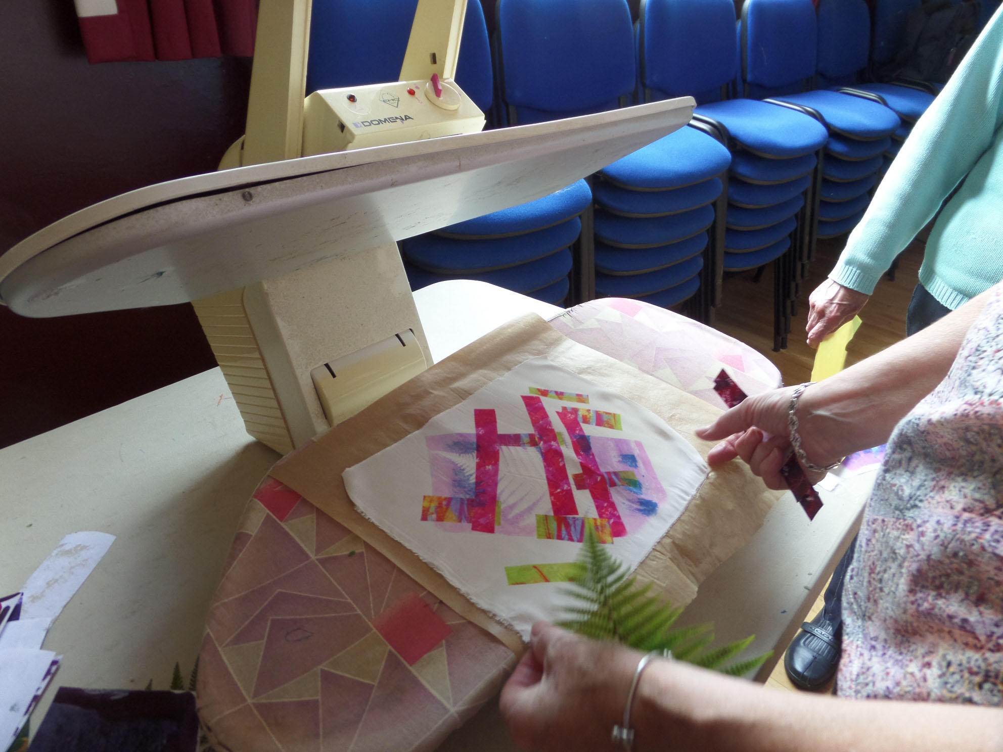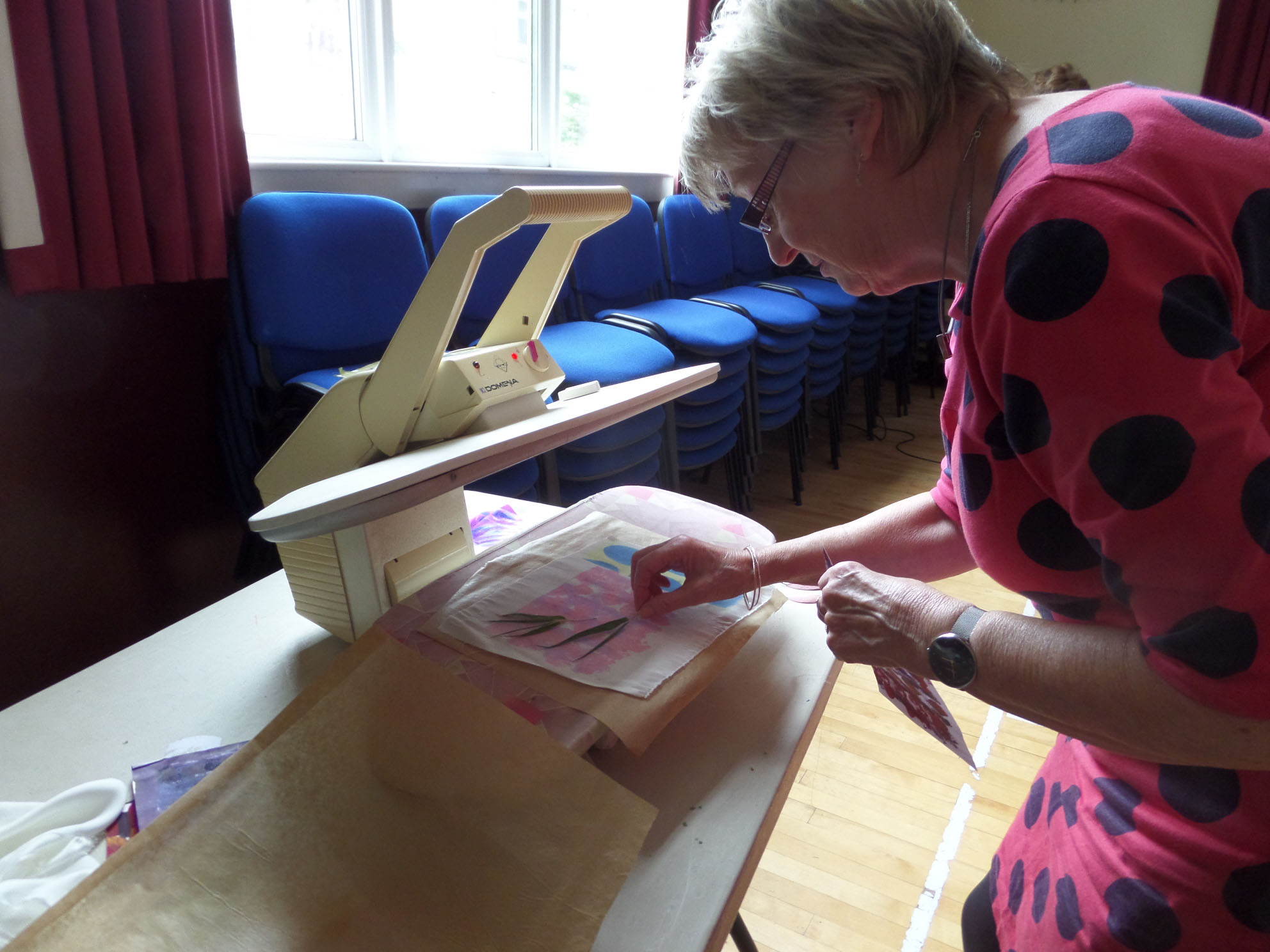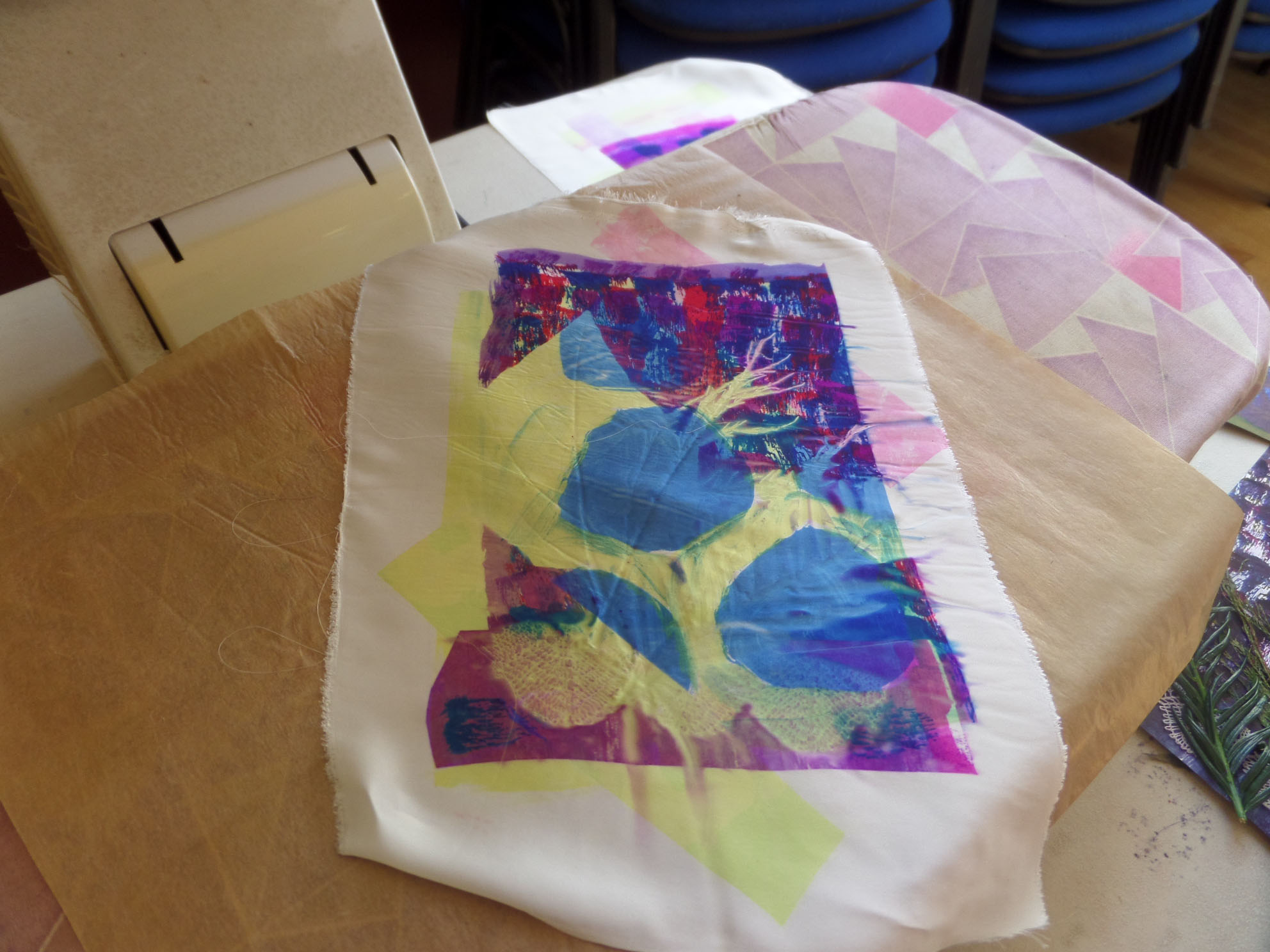 Great day today printing with transfer dyes in Gullane Large Village Hall. The sun shone as we had our first meeting of the new year. Many people came to join us and enjoyed transfer dyeing and free machining which some poeple wished to try.
