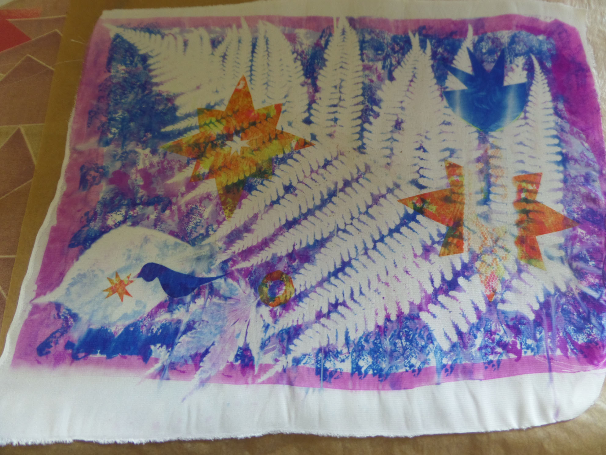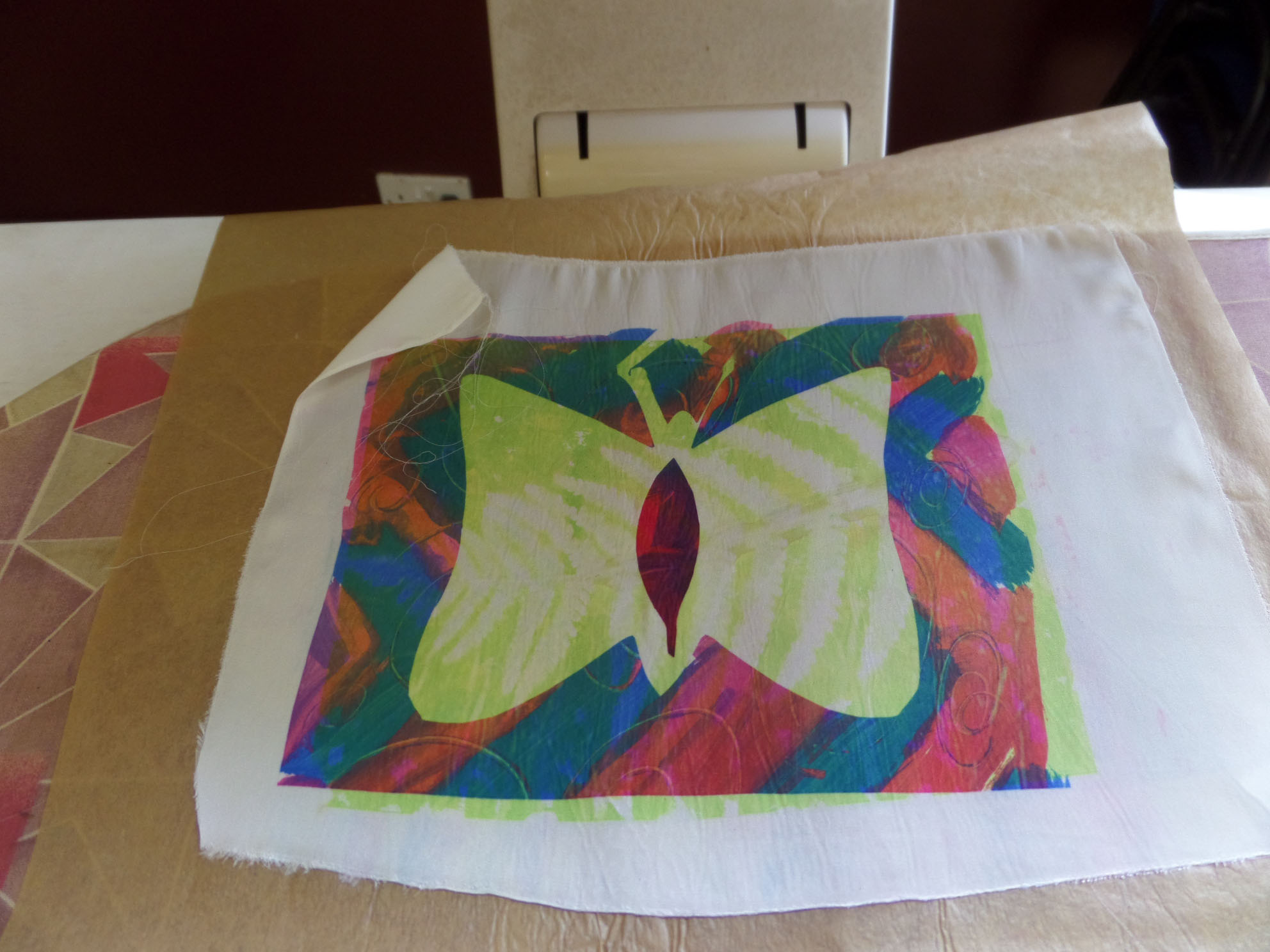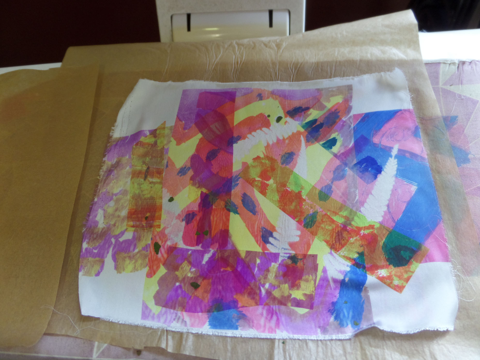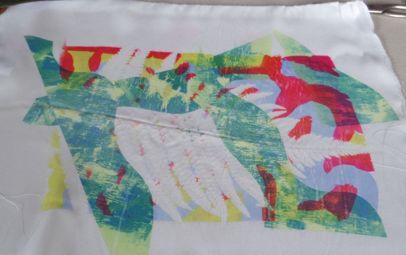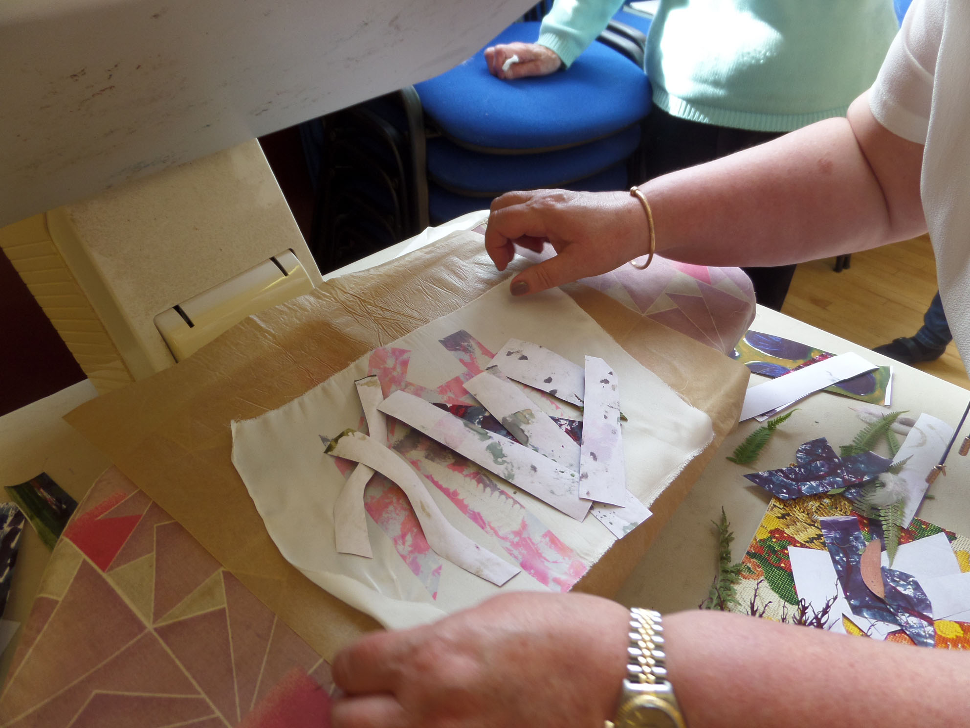 Great day today printing with transfer dyes in Gullane Large Village Hall. The sun shone as we had our first meeting of the new year. Many people came to join us and enjoyed transfer dyeing and free machining which some poeple wished to try.