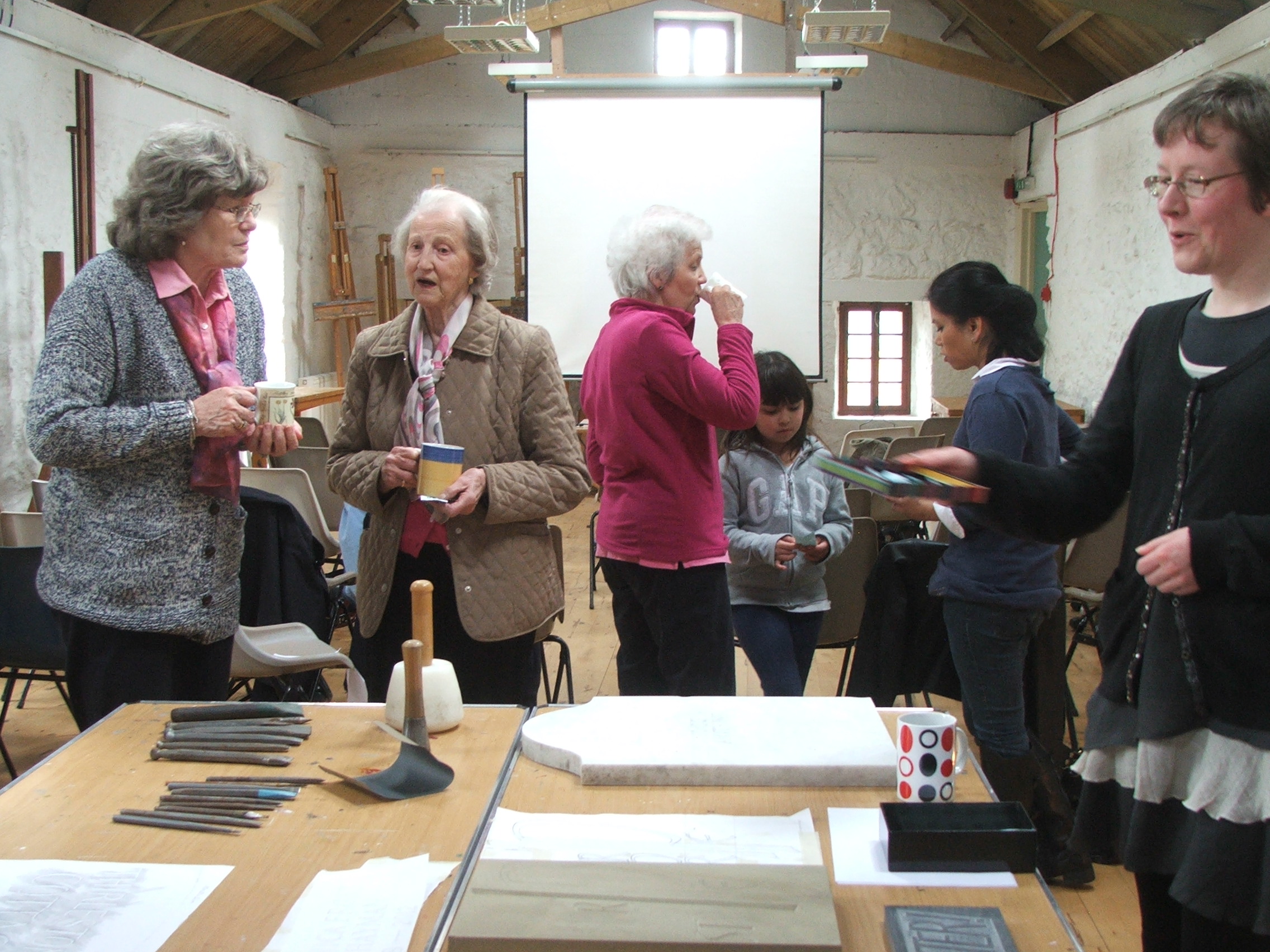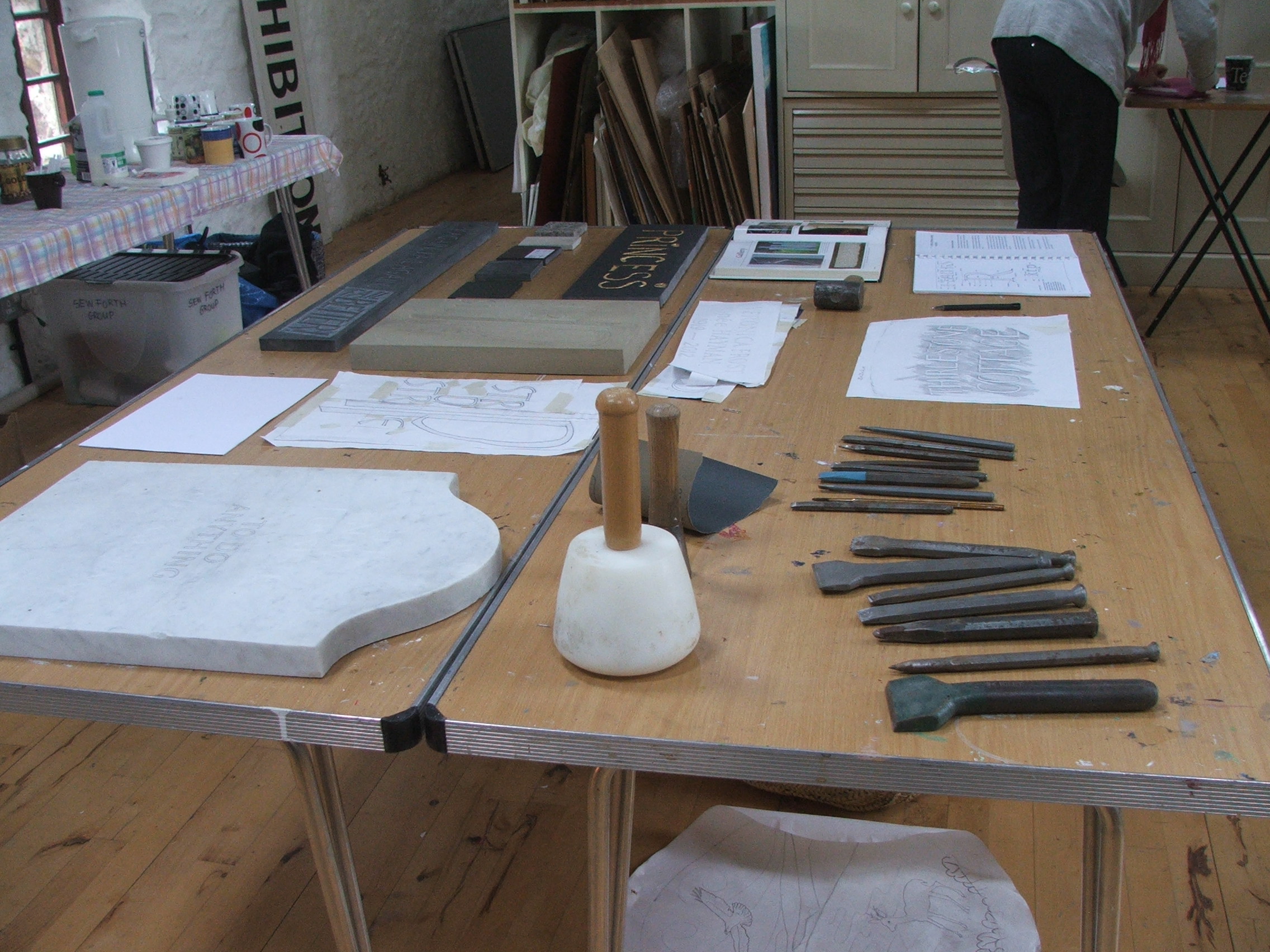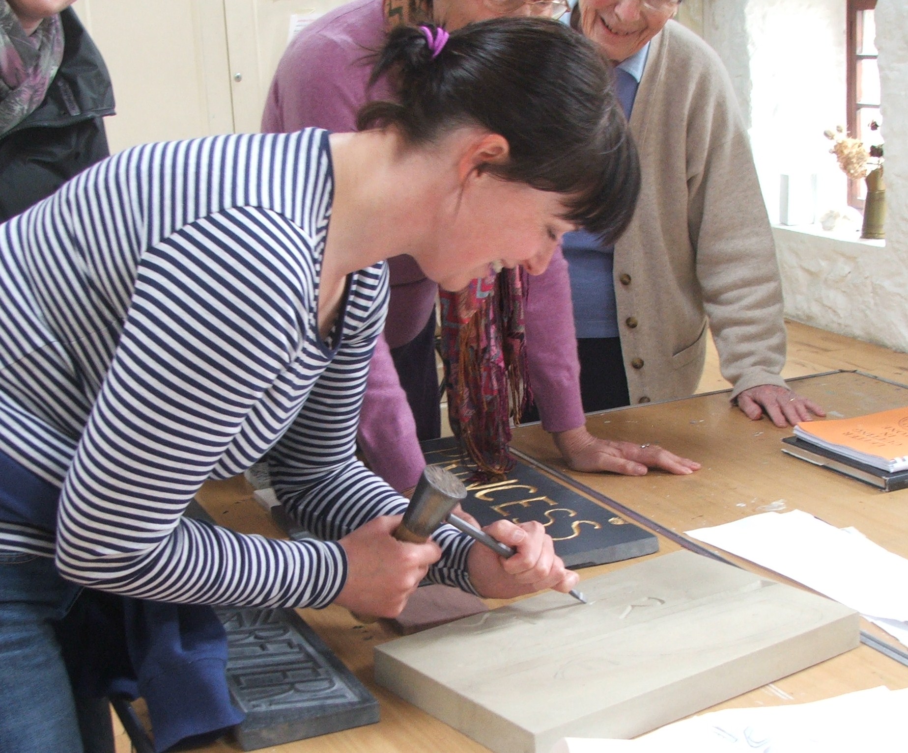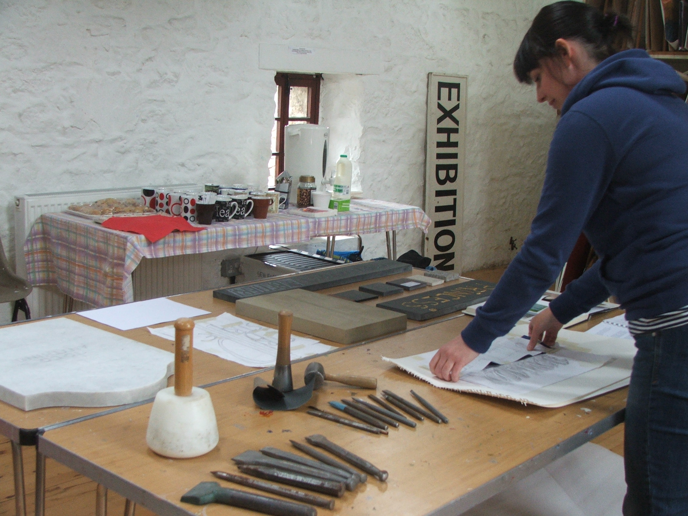 Now come on, how many of us are now studying the walls surrounding us! We were given a most instructive afternoon, viewing work in progress, seeing the tools that are used by Leigh and being allowed to feel the various stone samples that she had kindly brought along.